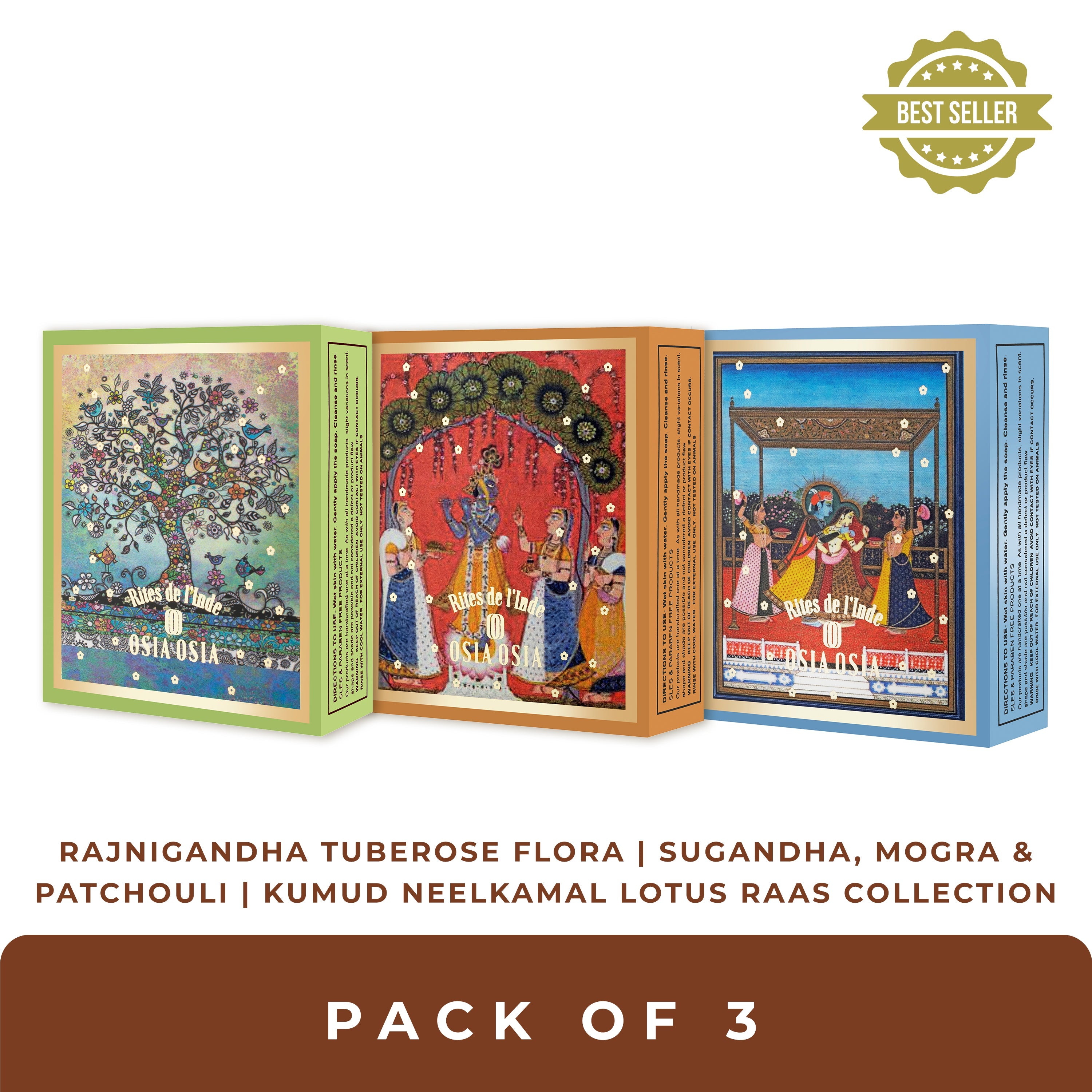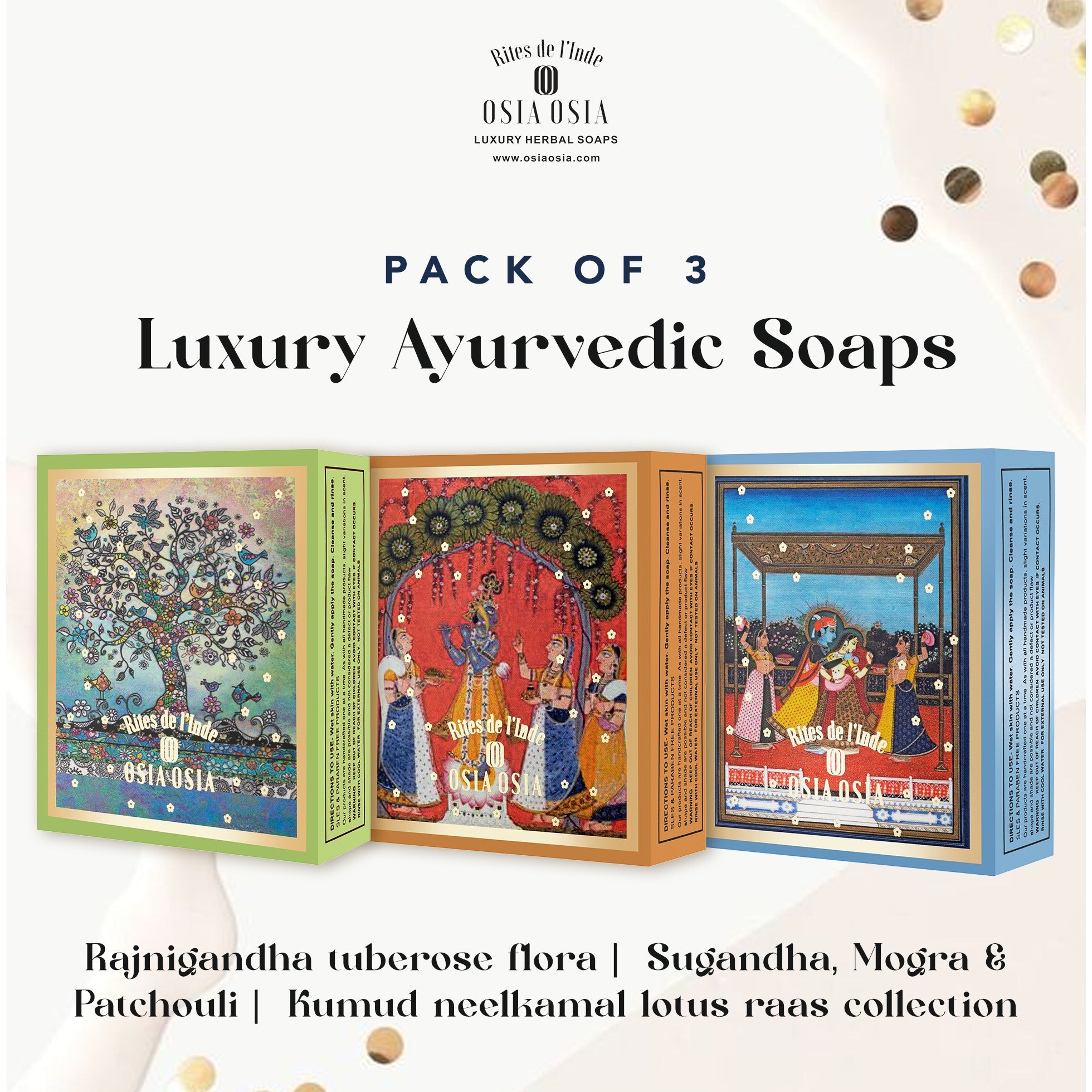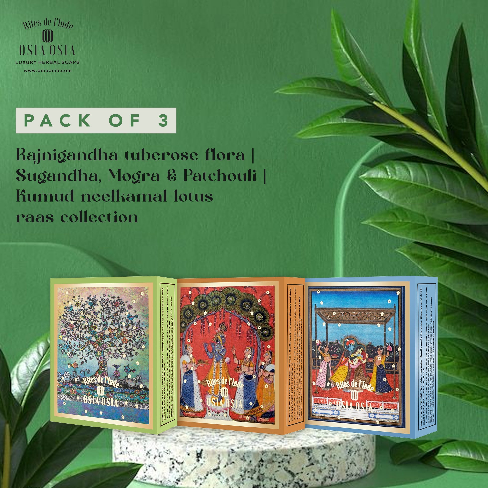 Introducing our Pack of 3 Ayurvedic Soaps - RajniGandha Tube Rose, Sugandha Mogra Patchouli, and Kumud Neel Kamal Lotus - designed to cleanse, nourish, and invigorate your skin with the power of nature. Here are the benefits of each soap:
