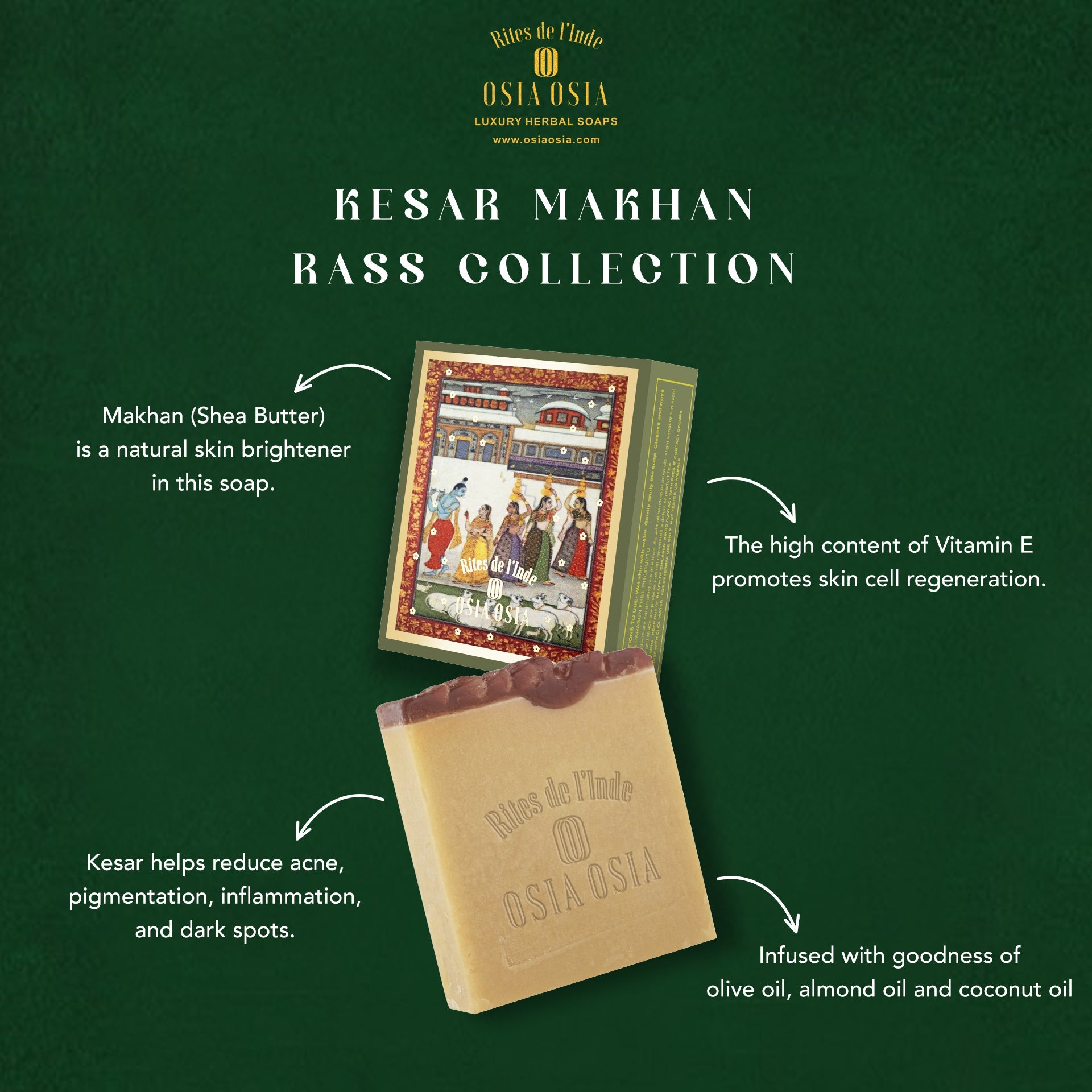 The Makhan (Shea Butter) used in this soap is a natural skin brightener. The high content of Vitamin E promotes regeneration of skin cells. When supplemented with Kesar (Saffron) it helps reduce acne, pigmentation, inflammation and also treats dark spots.