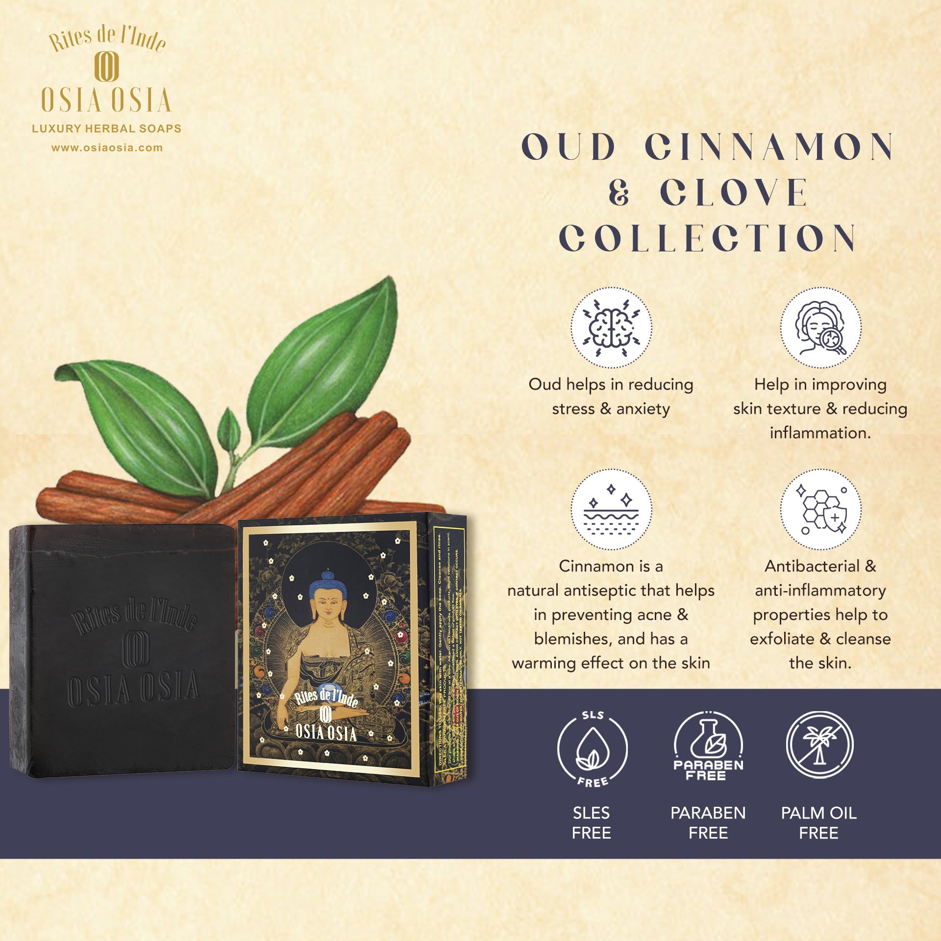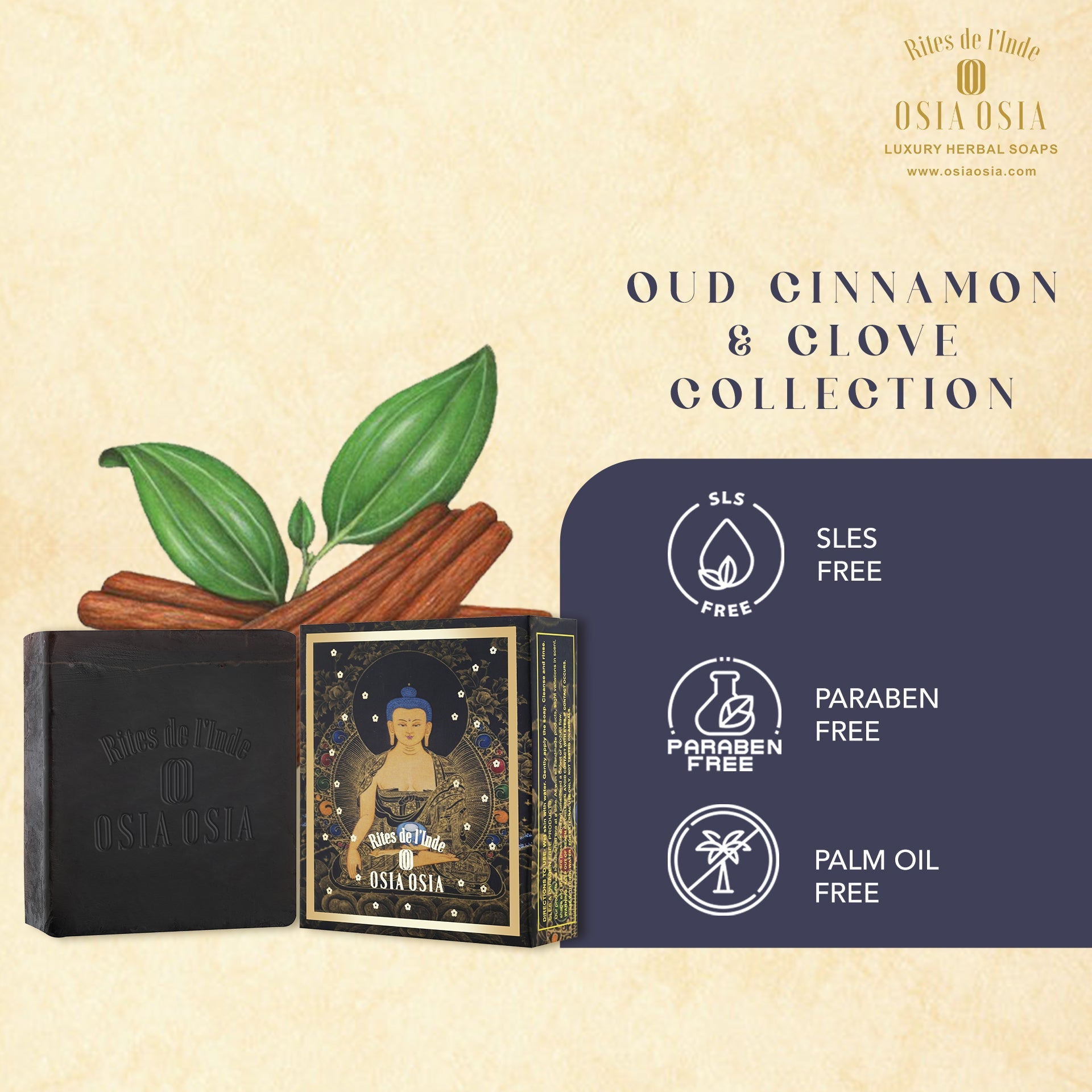 Each Soap Bar Contains Essential Oils from Resin Bark of agar wood Oudh ( Aquillaria Ferox) 1.5% and Oils from Bark of Cinnamon ( Cinnamonum Zeylanicum)1% and flower bud of Clove ( Syzigium Aromaticum) 0.5%